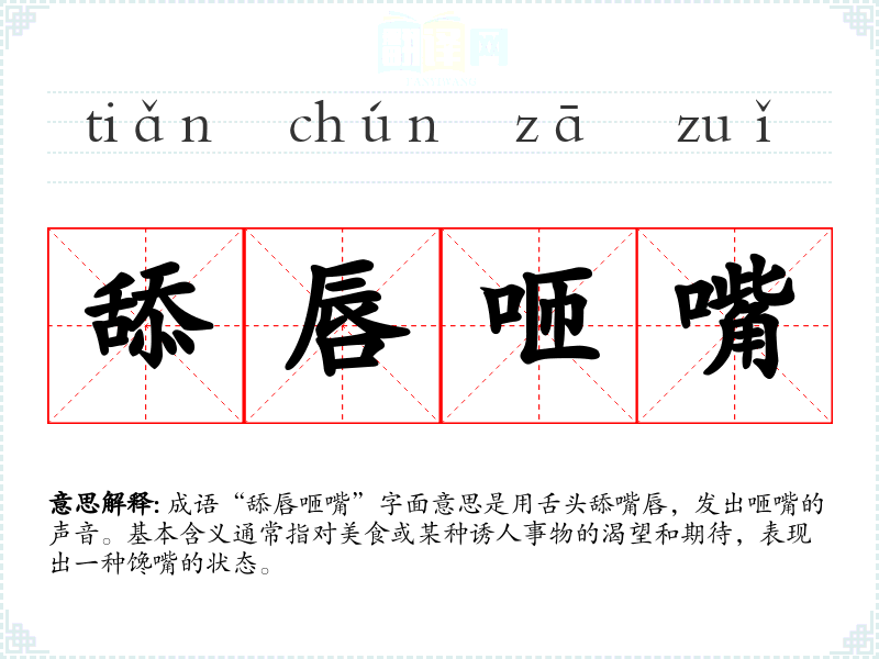成语“舔唇咂嘴”字面意思是用舌头舔嘴唇,发出咂嘴的声音。基本含义通常指对美食或某种诱人事物的渴望和期待,表现出一种馋嘴的状态。