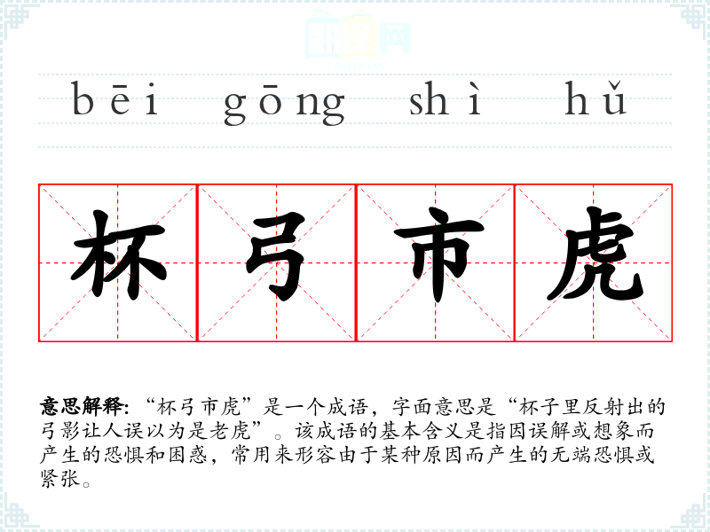 “杯弓市虎”是一个成语,字面意思是“杯子里反射出的弓影让人误以为是**”。该成语的基本含义是指因误解或想象而产生的恐惧和困惑,常用来形容由于某种原因而产生的无端恐惧或紧张。