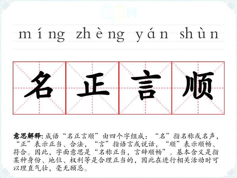 成语“名正言顺”由四个字组成:“名”指名称或名声,“正”表示正当、合法,“言”指语言或说话,“顺”表示顺畅、符合。因此,字面意思是“名称正当,言辞顺畅”。基本含义是指某种身份、地位、权利等是合理正当的,因此在进行相关活动时可以理直气壮,毫无顾忌。