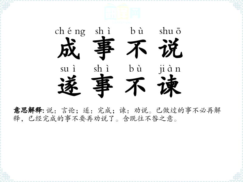 说:解说。原指事情已成,不要再解说;后指事情已过,不要再解说。 |