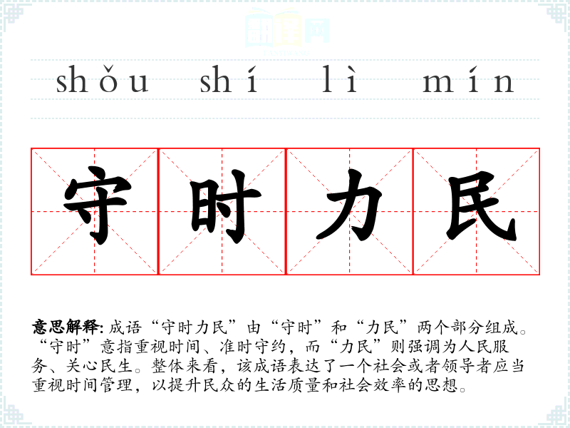 成语“守时力民”由“守时”和“力民”两个部分组成。“守时”意指重视时间、准时守约,而“力民”则强调为人民服务、关心民生。整体来看,该成语表达了一个社会或者领导者应当重视时间管理,以提升民众的生活质量和社会效率的思想。