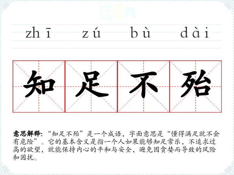 “知足不殆”是一个成语,字面意思是“懂得满足就不会有危险”。它的基本含义是指一个人如果能够知足常乐,不追求过高的欲望,就能保持内心的平和与安全,避免因贪婪而导致的风险和困扰。