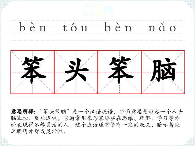 - 日常对话:用来形容朋友在学*上遇到困难时,可以说:“你怎么这么笨头笨脑的,快点想想!”
