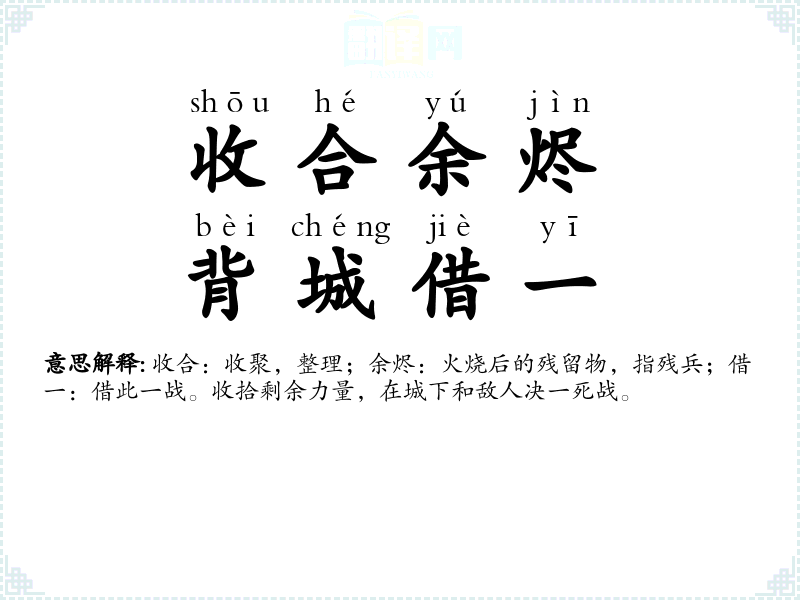 收合:收聚,整理;余烬:火烧后的残留物,指残兵;借一:借此一战。收拾剩余力量,在城下和敌人决一死战。 |
