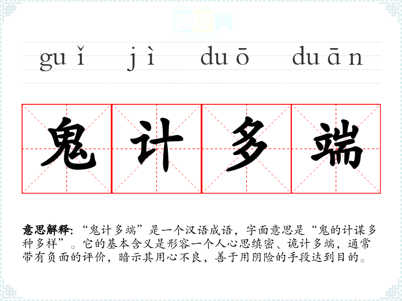 “鬼计多端”是一个汉语成语,字面意思是“鬼的计谋多种多样”。它的基本含义是形容一个人心思缜密、诡计多端,通常带有负面的评价,暗示其用心不良,善于用阴险的手段达到目的。