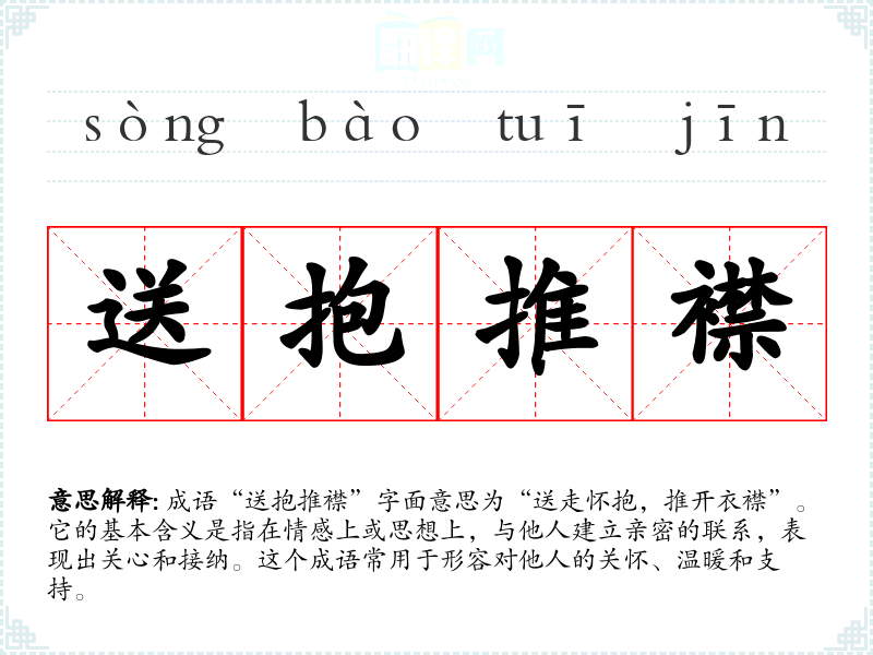 成语“送抱推襟”字面意思为“送走怀抱,推开衣襟”。它的基本含义是指在情感上或思想上,与他人建立亲密的联系,表现出关心和接纳。这个成语常用于形容对他人的关怀、温暖和支持。