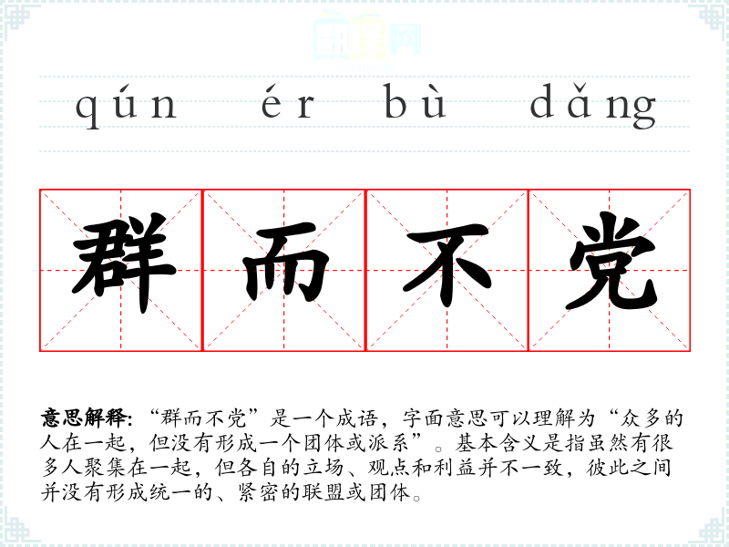 “群而不党”是一个成语,字面意思可以理解为“众多的人在一起,但没有形成一个团体或派系”。基本含义是指虽然有很多人聚集在一起,但各自的立场、观点和利益并不一致,彼此之间并没有形成统一的、紧密的联盟或团体。