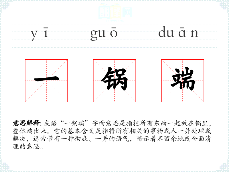 成语“一锅端”字面意思是指把所有东西一起放在锅里,整体端出来。它的基本含义是指将所有相关的事物或人一并处理或解决,通常带有一种彻底、一并的语气,暗示着不留余地或全面清理的意思。