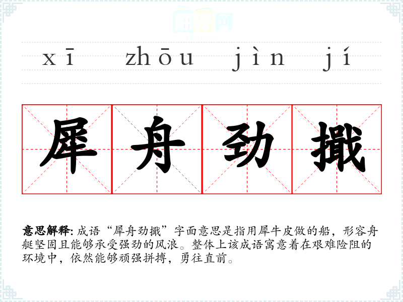 成语“犀舟劲擑”字面意思是指用犀牛皮做的船,形容舟艇坚固且能够承受强劲的风浪。整体上该成语寓意着在艰难险阻的环境中,依然能够顽强拼搏,勇往直前。