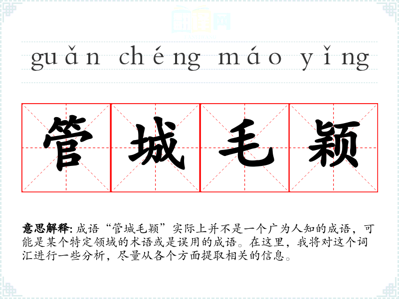 字面上,“管城”可以理解为与“城”相关的“管辖”或“管理”,“毛颖”可能指的是某种特定的细节或微小的事物。整体上,这个组合可能暗指对某个地方或事物的细致管理。然而,由于这个组合并不常见,具体的含义可能需要根据上下文进行推测。
