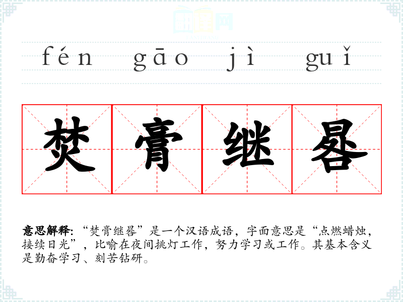 “焚膏继晷”是一个汉语成语,字面意思是“点燃蜡烛,接续日光”,比喻在夜间挑灯工作,努力学或工作。其基本含义是勤奋学、刻苦钻研。
