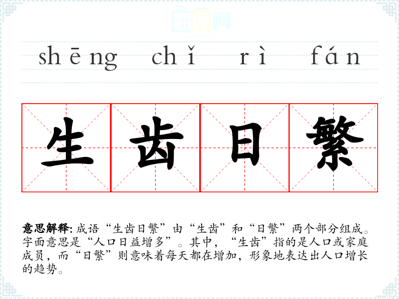 成语“生齿日繁”由“生齿”和“日繁”两个部分组成。字面意思是“人口日益增多”。其中,“生齿”指的是人口或家庭成员,而“日繁”则意味着每天都在增加,形象地表达出人口增长的趋势。