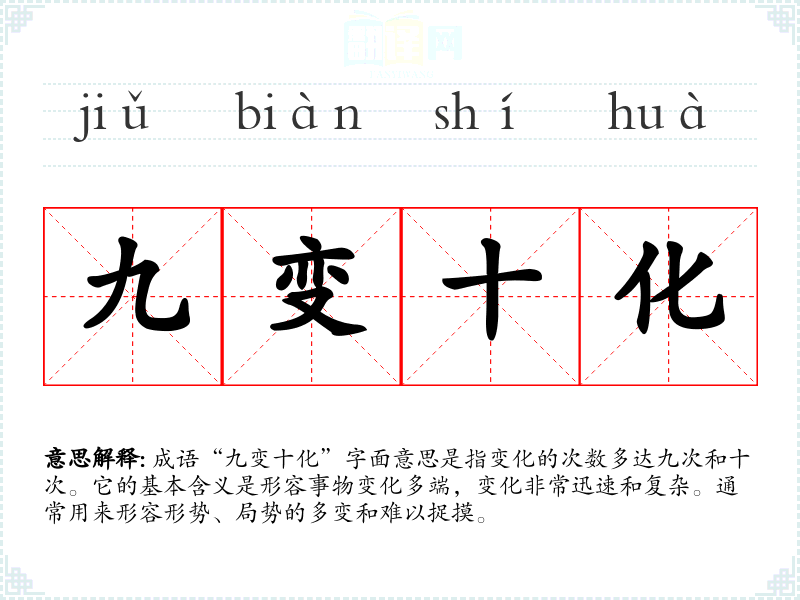 “九变十化”这个成语的具体历史来源不太明确,但从字面上看,数字“九”和“十”在**文化中常被用来表示极致或完美,变化多次也暗示着灵活性和应变能力。类似的成语在古代文献中时有出现,反映出古人对变化和适应能力的重视。
