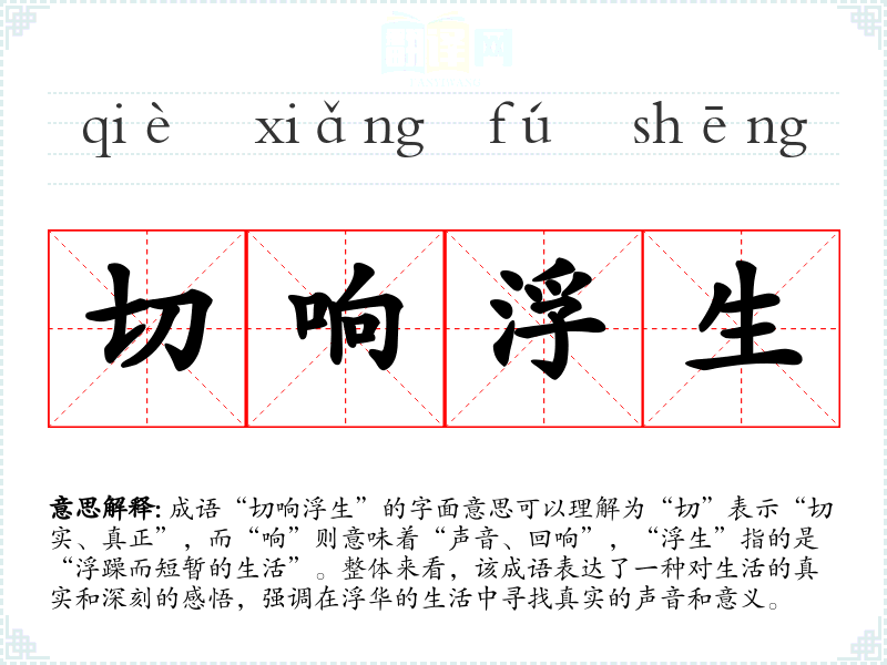 成语“切响浮生”的字面意思可以理解为“切”表示“切实、真正”,而“响”则意味着“声音、回响”,“浮生”指的是“浮躁而短暂的生活”。整体来看,该成语表达了一种对生活的真实和深刻的感悟,强调在浮华的生活中寻找真实的声音和意义。