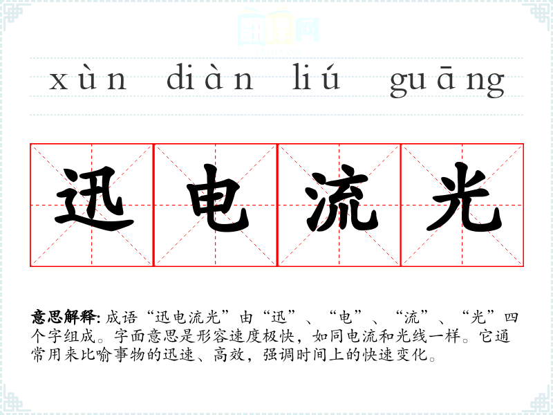 成语“迅电流光”由“迅”、“电”、“流”、“光”四个字组成。字面意思是形容速度极快,如同电流和光线一样。它通常用来比喻事物的迅速、高效,强调时间上的快速变化。