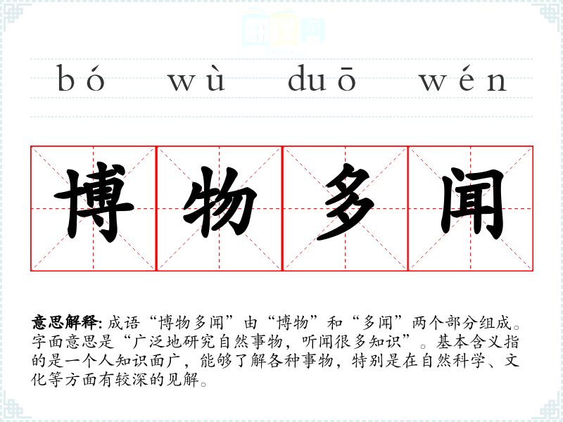 成语“博物多闻”由“博物”和“多闻”两个部分组成。字面意思是“广泛地研究自然事物,听闻很多知识”。基本含义指的是一个人知识面广,能够了解各种事物,特别是在自然科学、文化等方面有较深的见解。