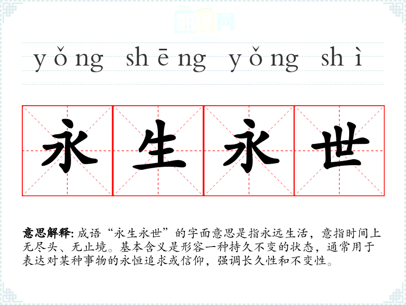 成语“**永世”的字面意思是指永远生活,意指时间上无尽头、无止境。基本含义是形容一种持久不变的状态,通常用于表达对某种事物的永恒追求或信仰,强调长久性和不变性。