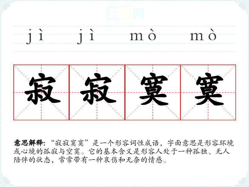 “寂寂寞寞”是一个形容词性成语,字面意思是形容环境或心境的孤寂与空寞。它的基本含义是形容人处于一种孤独、无人陪伴的状态,常常带有一种哀伤和无奈的情感。