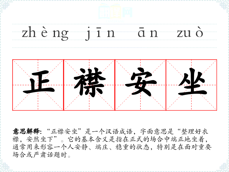 “正襟安坐”是一个汉语成语,字面意思是“整理好衣襟,安然坐下”。它的基本含义是指在正式的场合中端正地坐着,通常用来形容一个人安静、端庄、稳重的状态,特别是在面对重要场合或严肃话题时。