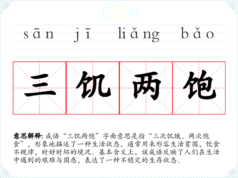 成语“三饥两饱”字面意思是指“三次饥饿、两次饱食”,形象地描述了一种生活状态,通常用来形容生活贫困,饮食不规律,时好时坏的境况。基本含义上,该成语反映了人们在生活中遇到的艰难与困惑,表达了一种不稳定的生存状态。