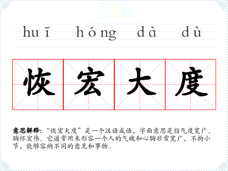 “恢宏大度”是一个汉语成语,字面意思是指气度宽广、胸怀宏伟。它通常用来形容一个人的气魄和心胸非常宽广,不拘小节,能够容纳不同的意见和事物。