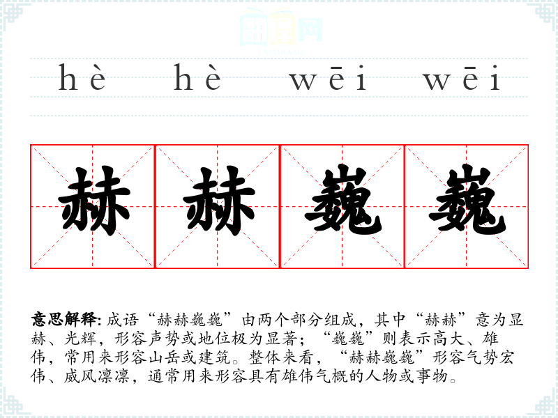 成语“赫赫巍巍”由两个部分组成,其中“赫赫”意为显赫、光辉,形容声势或地位极为显著;“巍巍”则表示高大、雄伟,常用来形容山岳或建筑。整体来看,“赫赫巍巍”形容气势宏伟、威风凛凛,通常用来形容具有雄伟气概的人物或事物。
