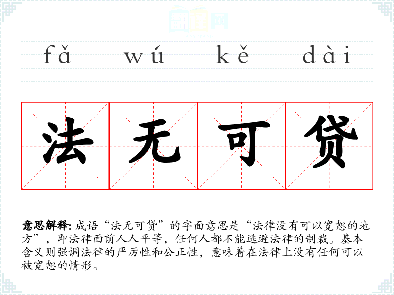 成语“法无可贷”的字面意思是“法律没有可以宽恕的地方”,即法律面前人人平等,任何人都不能逃避法律的制裁。基本含义则强调法律的严厉性和公正性,意味着在法律上没有任何可以被宽恕的情形。