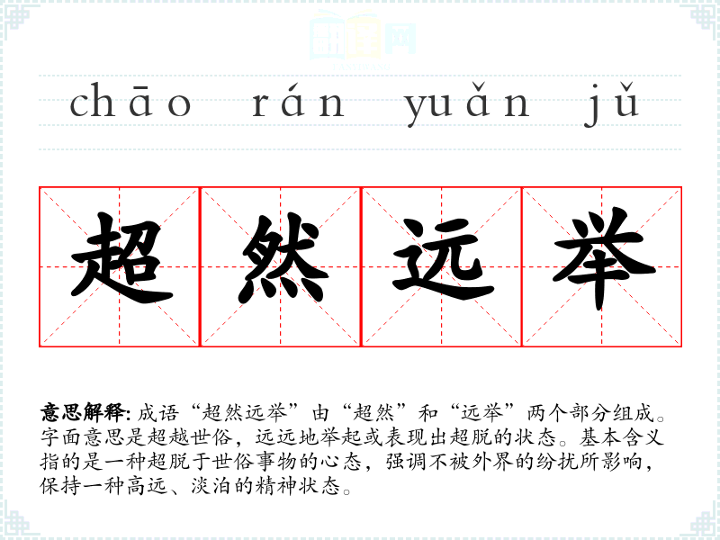 成语“超然远举”由“超然”和“远举”两个部分组成。字面意思是超越世俗,远远地举起或表现出超脱的状态。基本含义指的是一种超脱于世俗事物的心态,强调不被外界的纷扰所影响,保持一种高远、淡泊的精神状态。