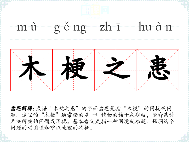 成语“木梗之患”的字面意思是指“木梗”的困扰或问题。这里的“木梗”通常指的是一种植物的枯干或残枝,隐喻某种无法解决的问题或困扰。基本含义是指一种困境或难题,强调这个问题的顽固性和难以处理的特征。