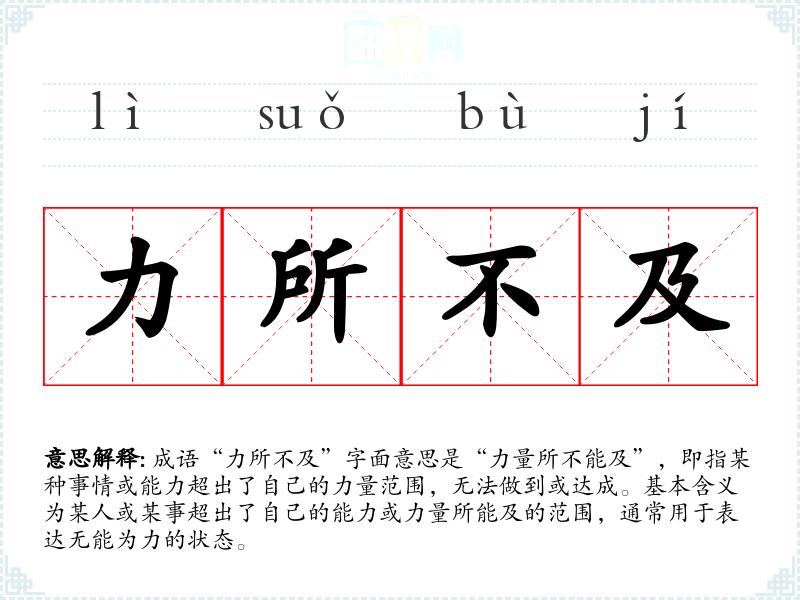 成语“力所不及”字面意思是“力量所不能及”,即指某种事情或能力超出了自己的力量范围,无法做到或达成。基本含义为某人或某事超出了自己的能力或力量所能及的范围,通常用于表达无能为力的状态。