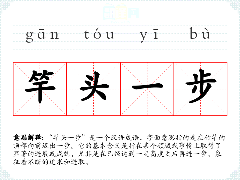 “竿头一步”是一个汉语成语,字面意思指的是在竹竿的顶部向前迈出一步。它的基本含义是指在某个领域或事情上取得了显著的进展或成就,尤其是在已经达到一定高度之后再进一步,象征着不断的追求和进取。