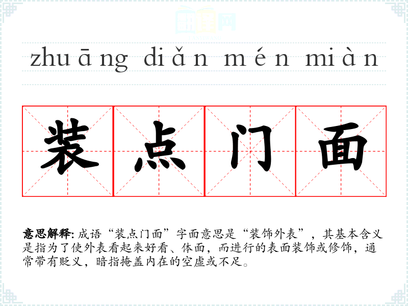 成语“装点门面”字面意思是“装饰外表”,其基本含义是指为了使外表看起来好看、体面,而进行的表面装饰或修饰,通常带有贬义,暗指掩盖内在的空虚或不足。