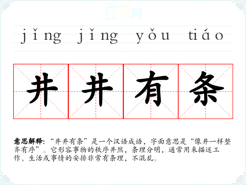 “井井有条”是一个汉语成语,字面意思是“像井一样整齐有序”。它形容事物的秩序井然,条理分明,通常用来描述工作、生活或事情的安排非常有条理,不混乱。