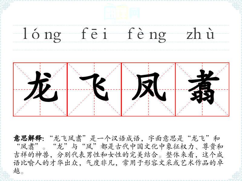 在**传统文化中,龙和凤代表着至高无上的权力和地位,因此“龙飞凤翥”不仅仅是对才华的赞美,更承载着对成功和权威的向往。在现代社会,这个成语仍然适用,尤其在艺术、文学和职场等领域,大家对优秀表现的赞美和追求依然存在。