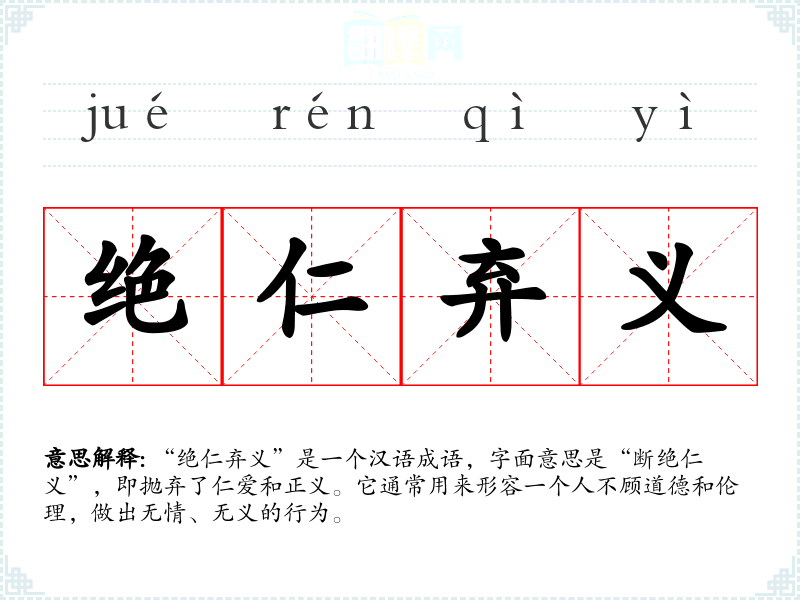“绝仁弃义”是一个汉语成语,字面意思是“断绝仁义”,即抛弃了仁爱和正义。它通常用来形容一个人不顾道德和伦理,做出无情、无义的行为。