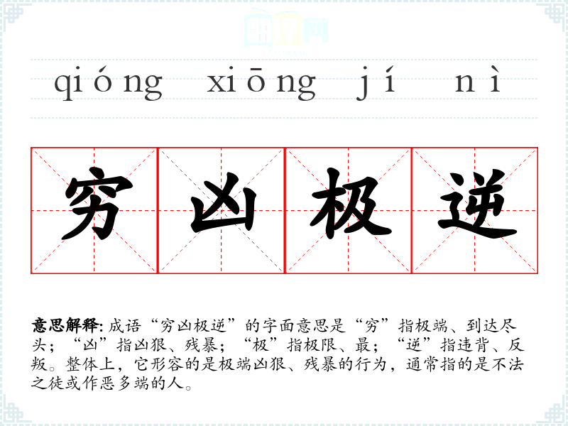 成语“穷凶极逆”的字面意思是“穷”指极端、到达尽头;“凶”指凶狠、残暴;“极”指极限、最;“逆”指违背、反叛。整体上,它形容的是极端凶狠、残暴的行为,通常指的是不法之徒或作恶多端的人。