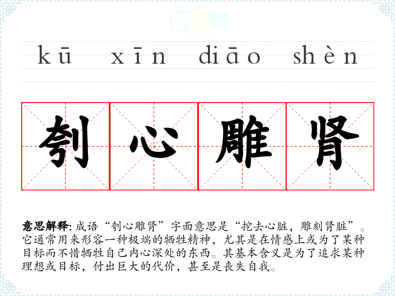 成语“刳心雕肾”字面意思是“挖去心脏,雕刻肾脏”。它通常用来形容一种极端的牺牲精神,尤其是在情感上或为了某种目标而不惜牺牲自己内心深处的东西。其基本含义是为了追求某种理想或目标,付出巨大的代价,甚至是丧失自我。