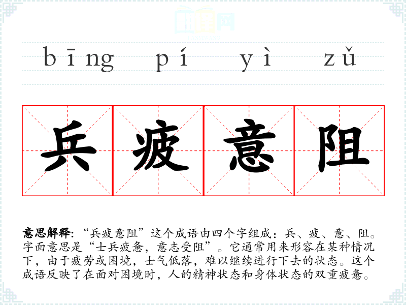 “兵疲意阻”这个成语由四个字组成:兵、疲、意、阻。字面意思是“士兵疲惫,意志受阻”。它通常用来形容在某种情况下,由于疲劳或困境,士气低落,难以继续进行下去的状态。这个成语反映了在面对困境时,人的精神状态和身体状态的双重疲惫。