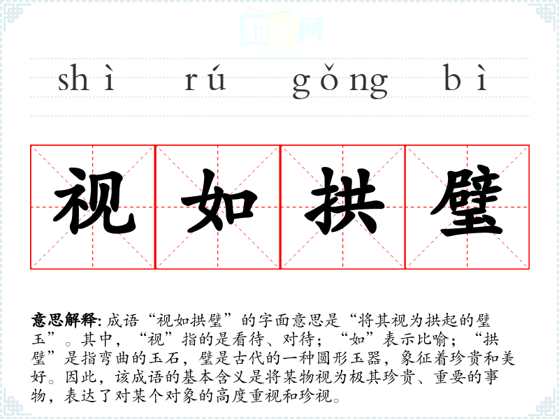 成语“视如拱璧”的字面意思是“将其视为拱起的璧玉”。其中,“视”指的是看待、对待;“如”表示比喻;“拱璧”是指弯曲的玉石,璧是古代的一种圆形玉器,象征着珍贵和美好。因此,该成语的基本含义是将某物视为极其珍贵、重要的事物,表达了对某个对象的高度重视和珍视。