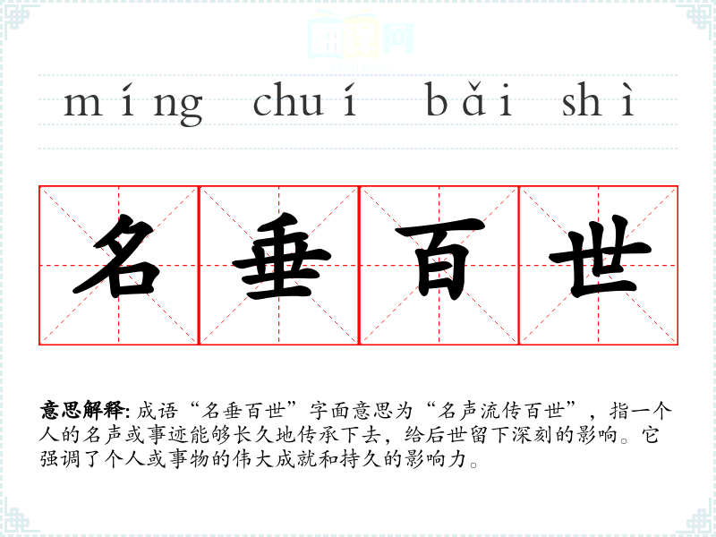 成语“名垂百世”字面意思为“名声流传百世”,指一个人的名声或事迹能够长久地传承下去,给后世留下深刻的影响。它强调了个人或事物的伟大成就和持久的影响力。