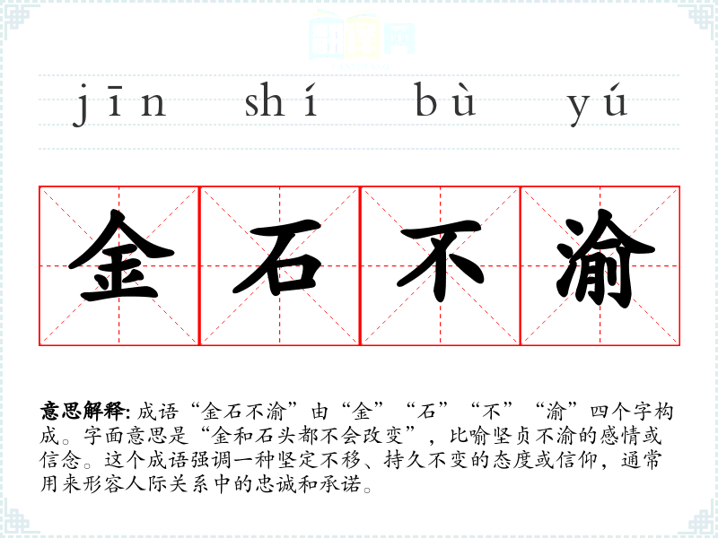 成语“金石不渝”由“金”“石”“不”“渝”四个字构成。字面意思是“金和石头都不会改变”,比喻坚贞不渝的感情或信念。这个成语强调一种坚定不移、持久不变的态度或信仰,通常用来形容人际关系中的忠诚和承诺。