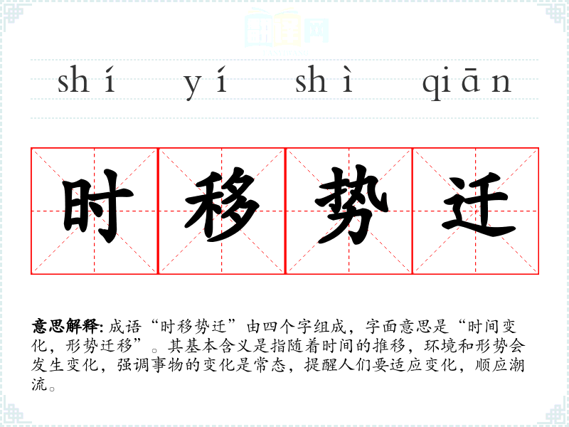 成语“时移势迁”由四个字组成,字面意思是“时间变化,形势迁移”。其基本含义是指随着时间的推移,环境和形势会发生变化,强调事物的变化是常态,提醒人们要适应变化,顺应潮流。