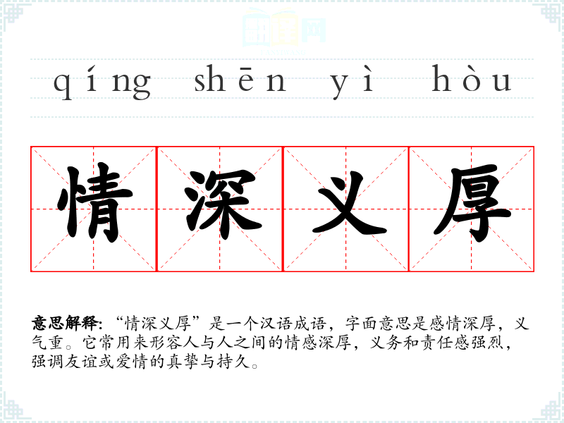 “情深义厚”是一个汉语成语,字面意思是感情深厚,义气重。它常用来形容人与人之间的情感深厚,义务和责任感强烈,强调友谊或爱情的真挚与持久。