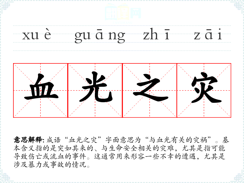 该成语通常用于描述突发的、带有暴力性质的**,常见于文学作品、民间故事以及现代日常对话中。例如,在某些小说中,角色可能会因为不慎而遭遇“血光之灾”,而在日常对话中,人们也可能会用该成语来形容某次意外事故。