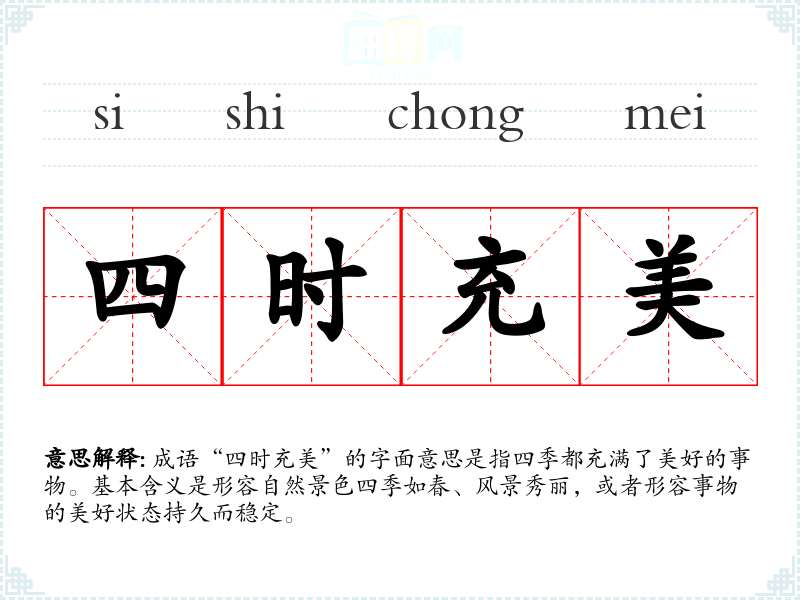 “四时充美”出自《诗经·小雅》,原文中提到自然的美好与丰饶,表现了古代人们对自然的崇敬和对美好生活的向往。这一成语表现了四季交替中各种美景的和谐美好,是中华文化中一种对自然美的赞美。