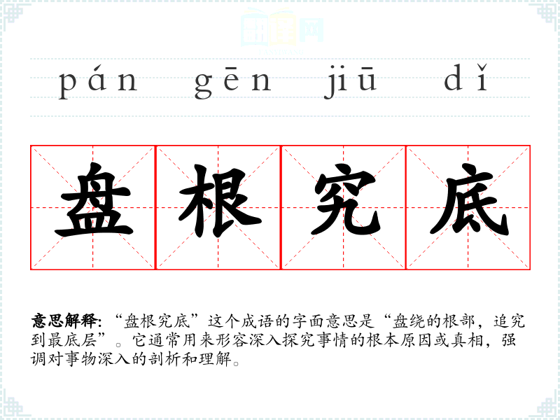 “盘根究底”这个成语的字面意思是“盘绕的根部,追究到最底层”。它通常用来形容深入探究事情的根本原因或真相,强调对事物深入的剖析和理解。