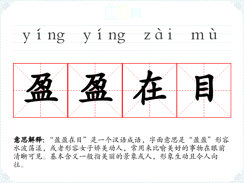 “盈盈在目”常给人以轻盈、愉悦的感觉,联想到美好的事物,如自然风光、优雅的人物等。在表达时,它能够传达出一种向往和赞美的情感,使语言更加生动。