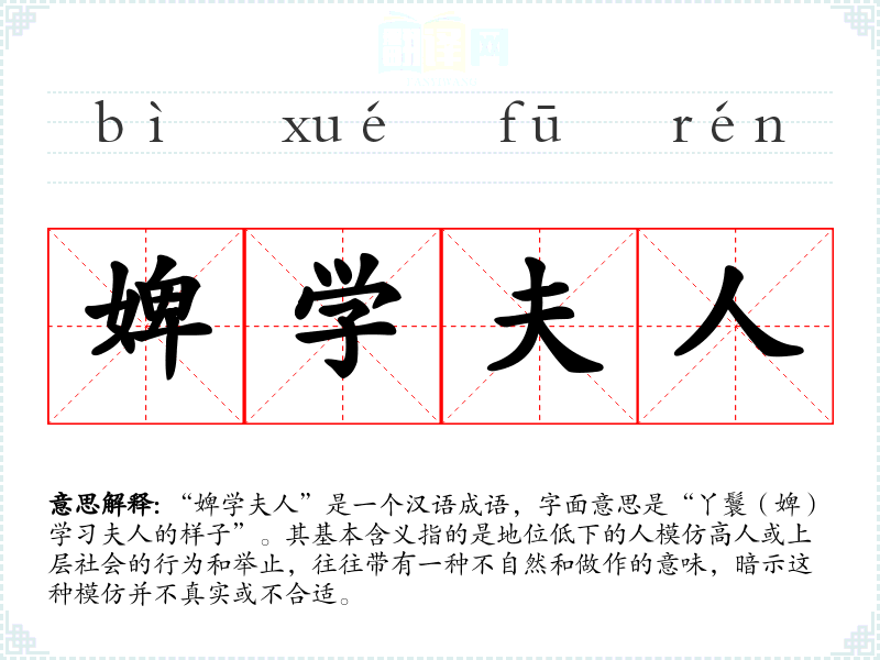 “婢学夫人”是一个汉语成语,字面意思是“丫鬟(婢)学*夫人的样子”。其基本含义指的是地位低下的人模仿高人或上层社会的行为和举止,往往带有一种不自然和做作的意味,暗示这种模仿并不真实或不合适。