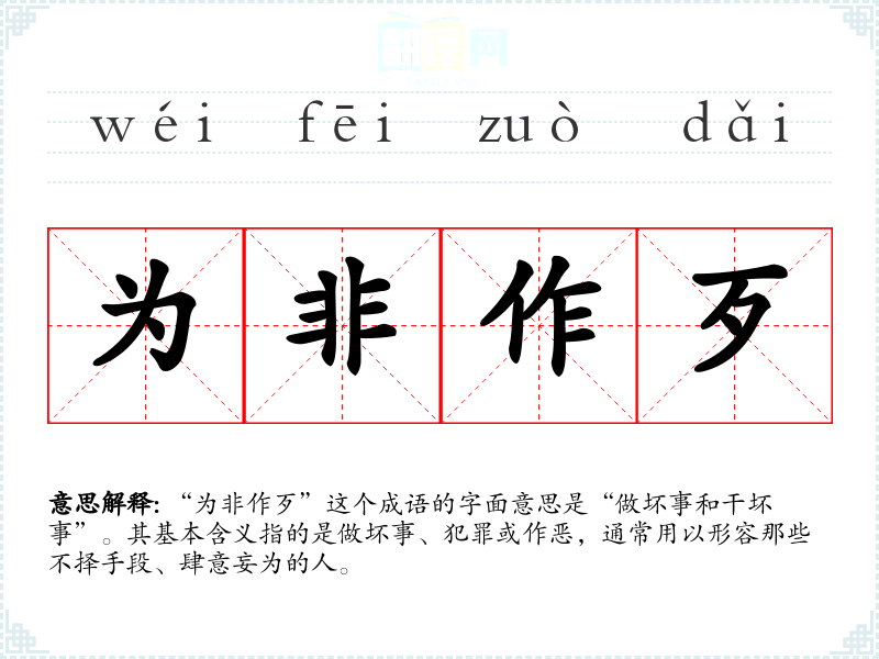 “为非作歹”这个成语的字面意思是“做坏事和干坏事”。其基本含义指的是做坏事、犯罪或作恶,通常用以形容那些不择手段、肆意妄为的人。