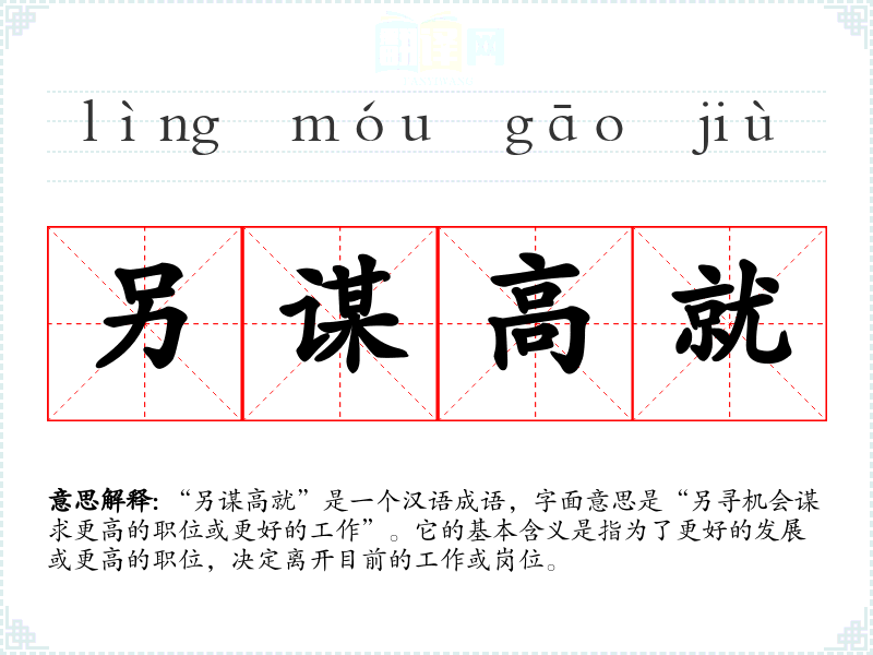 “另谋高就”是一个汉语成语,字面意思是“另寻机会谋求更高的职位或更好的工作”。它的基本含义是指为了更好的发展或更高的职位,决定离开目前的工作或岗位。